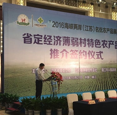 10月21日下午,作为2016海峡两岸(江苏)名优农产品展销会重要活动之一的“省定经济薄弱村特色农产品推介签约仪式”在镇江隆重举行。推介签约活动由省委农工办、省供销合作总社和镇江市人民政府主办。推介签约仪式由省供销合作总社党组书记、理事会主任诸纪录主持,镇江市长朱晓明致辞,省委农工办主任赵旻讲话。
