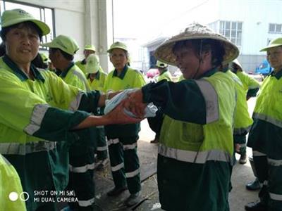 夏日炎炎,酷暑难当。连日来,港城持续高温,给市场一线工作人员带来严峻“烤”验。 8月6号上午,市场派员慰问在高温酷暑下工作的保洁员、车辆管理员、有机垃圾工作人员,将矿泉水、毛巾、风油精等防暑降温物品发放到他们手中,为他们送上一份关怀,一份清凉。并嘱咐大家注意防暑降温,在做好本职工作的同时注意身体健康。