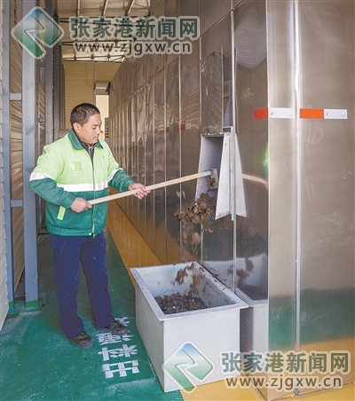 工作人员将菜叶、果皮等有机垃圾送入进料口。